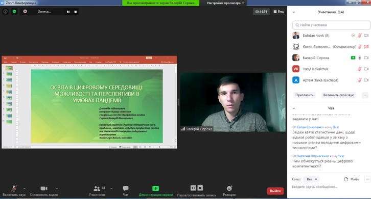 Цікавим був виступ Гуменного Олександра Дмитровича, кандидата педагогічних наук, доцента кафедри професійної та вищої освіти Центрального інституту післядипломної освіти ДЗВО «Університет менеджменту освіти» на тему «Ефективне використання відкритих онлайн-ресурсів у післядипломній освіті». Він розповів про особливості створення та застосування відкритих онлайн-ресурсів у післядипломній освіті, представив десять найкращих практик ефективної роботи педагогічних працівників в інтернеті, серед яких: «Будьте присутніми і адаптивними», «Установіть очікування, пропонуйте студентам виконувати прикладні завдання», «Виховуйте, підтримуючи інтернет-спільноту», «Подумайте, перш ніж написати текстове завдання», «Попросіть відгук», «Удосконалюйте особисті стосунки з кожним студентом», «Використовуйте групові та індивідуальні проєкти», «Використовуйте доступні ресурси», «Займіться завершальною діяльністю».