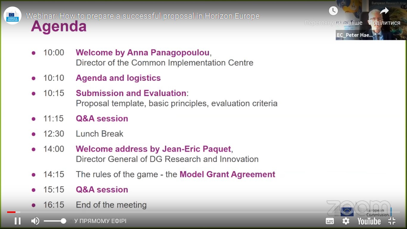 До учасників заходу з вітальним словом виступив Jean-Eric Paquet, генеральний директор директорату з досліджень та інновацій Європейської Комісії. В рамках заходу була надана інформація про програму «Горизонт Європа», шляхи підготовки та подачі проєктної пропозиції в рамках програми «Горизонт Європа»: основні принципи та критерії її оцінювання. Учасники інформаційного заходу мали можливість розглянути типову Грантову Угоду та зрозуміти основні “правила гри”.