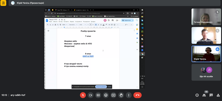 Спікер ознайомив слухачів з двома підходами у розробці програмного забезпечення, які відрізняються за своїми концепціями і призначенням – об’єктно-орієнтованим та подійно-орієнтованим програмуванням, продемонстрував алгоритм програмування мовою Python на конкретних прикладах, навів тематику проєктів для учнів 7-8 класів.