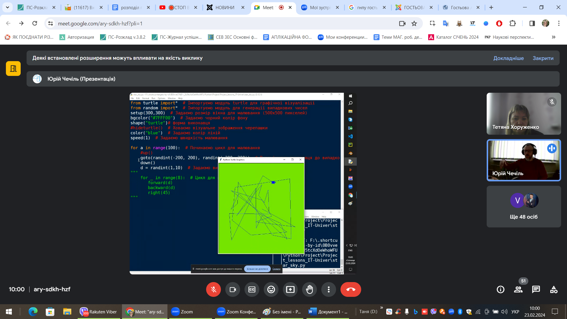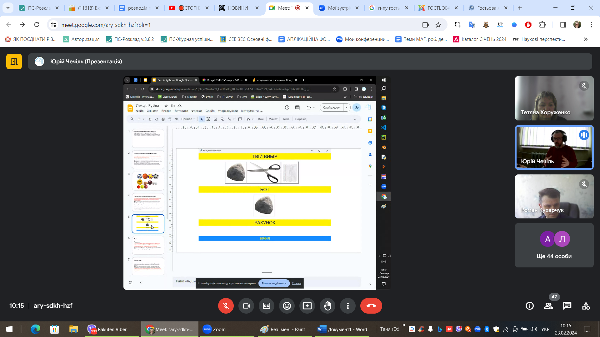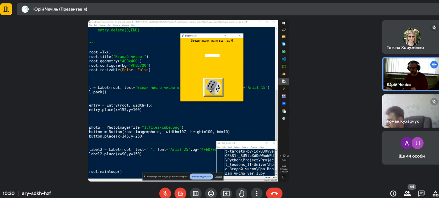 23 лютого 2024 року здобувачі вищої освіти освітнього ступеня «Бакалавр» Глухівського національного педагогічного університету імені Олександра Довженка спеціальності 014 Середня освіта, предметної спеціальності 014.10 Середня освіта (Трудове навчання та технології), які навчаються за освітньо-професійною програмою «Середня освіта (Трудове навчання та технології. Інформатика)» прослухали гостьову лекцію вчителя інформатики і технологій вищої категорії, старшого вчителя Сумської спеціалізованої школи №29 Чечіля Юрія Миколайовича на тему «Програмування мовою Python. Як зацікавити учнів?».