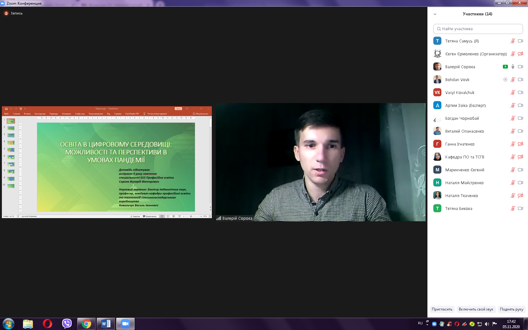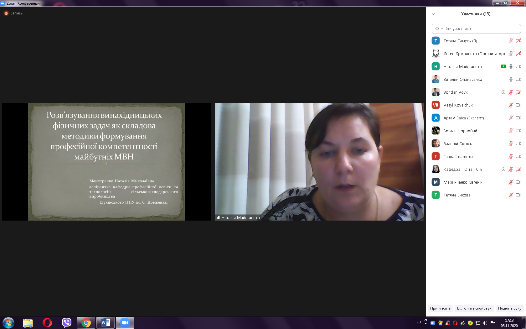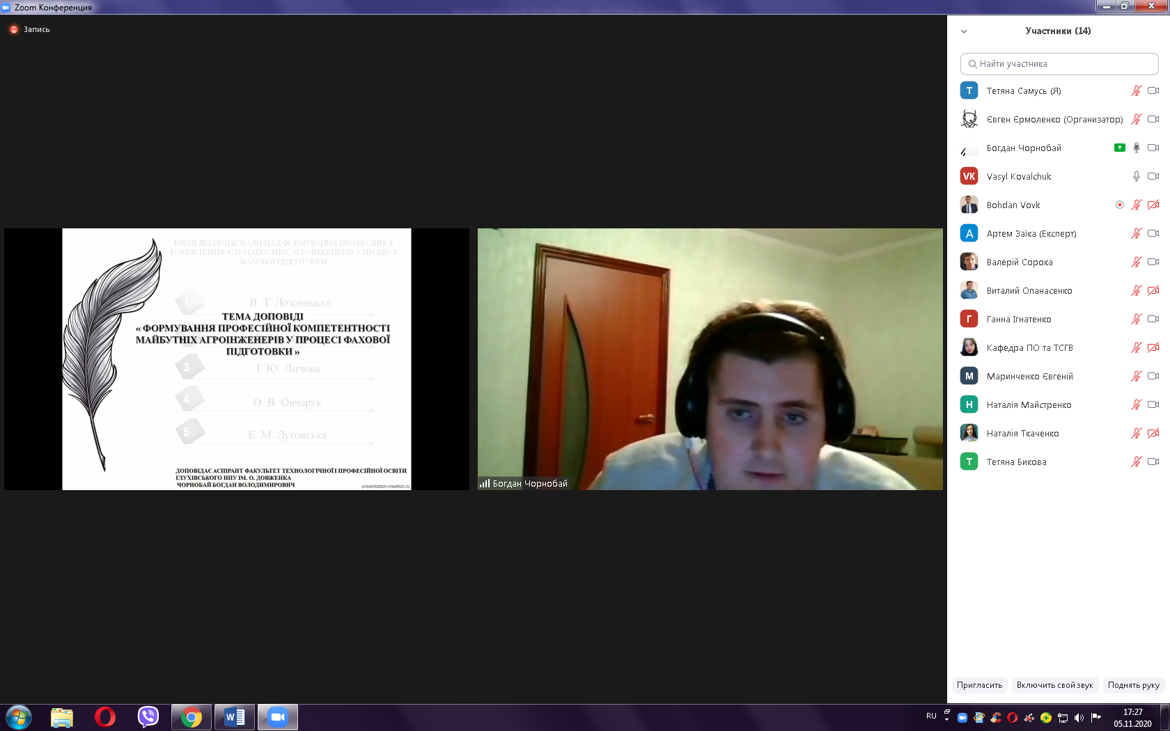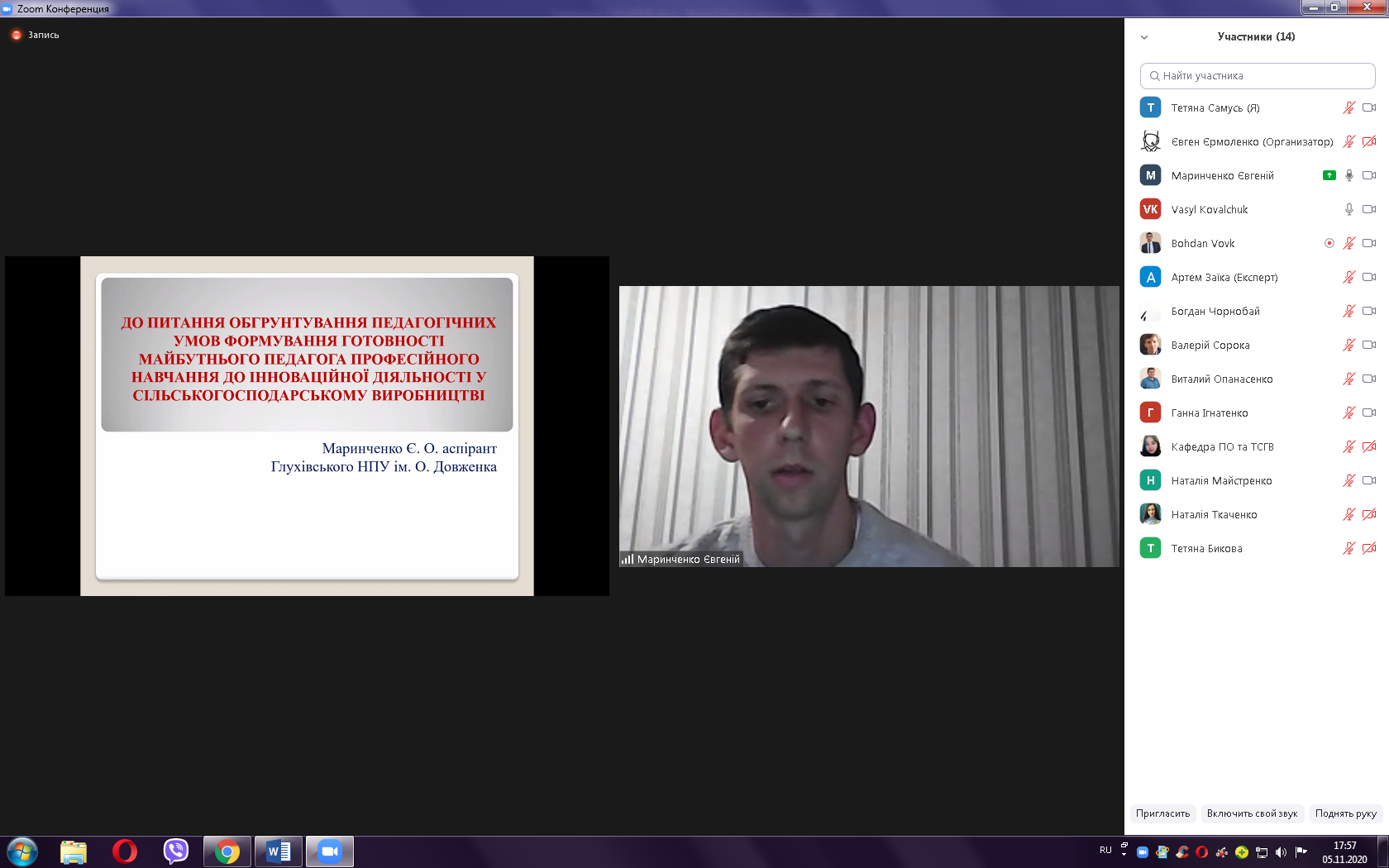 05 листопада 2020 року у рамках ІV Всеукраїнського науково-методичного семінару «Підготовка майстра виробничого навчання, викладача професійного навчання до впровадження в освітній процес інноваційних технологій» відбулося секційне засідання молодих науковців, на якому результати своїх досліджень презентували аспіранти кафедри професійної освіти та технологій сільськогосподарського виробництва ГНПУ ім. О. Довженка.