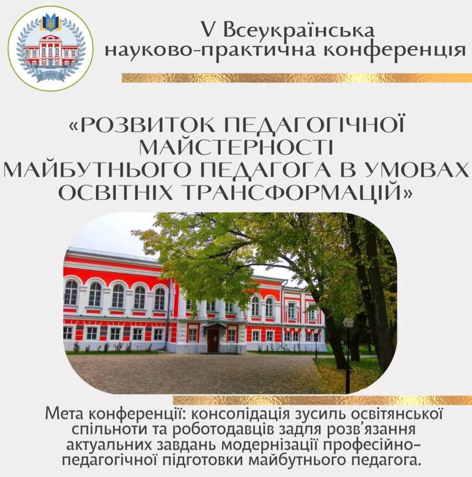 Запрошуємо Вас узяти участь у V Всеукраїнській науково-практичній конференції «Розвиток педагогічної майстерності майбутнього педагога в умовах освітніх трансформацій», яка проводиться за ініціативи