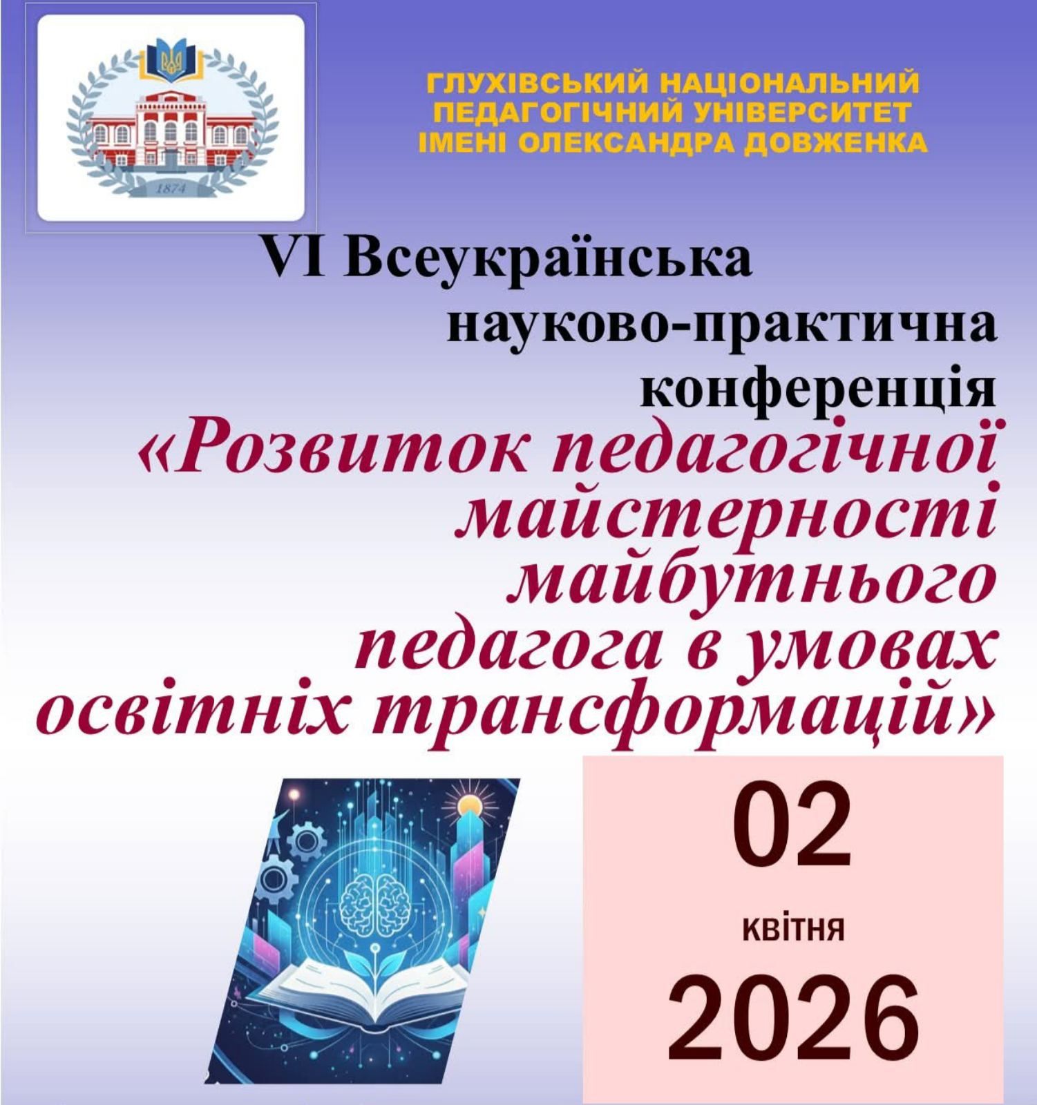 Запрошуємо Вас узяти участь у VІ Всеукраїнській науково-практичній конференції «Розвиток педагогічної майстерності майбутнього педагога в умовах освітніх трансформацій», яка проводиться за ініціативи кафедри професійної освіти і технологій сільськогосподарського виробництва Глухівського національного педагогічного університету імені Олександра Довженка 2 квітня 2026 року.