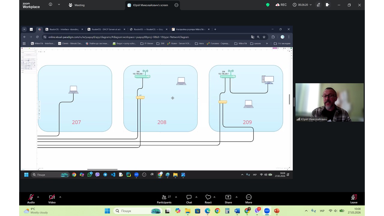 У межах професійної підготовки здобувачів освіти 27.03.2026 р. відбулася гостьова лекція, яку провів вчитель інформатики Сумської школи №29 Чечіль Юрій Миколайович. Тема лекції «Проєктування та побудова комп’ютерної мережі школи». Спікер представив унікальний кейс технічної еволюції освітнього простору: від першого модемного підключення до створення розгалуженої системи за принципом «зірки», що сьогодні охоплює понад 70 приміщень закладу. Цей досвід став яскравим прикладом того, як системний підхід до проєктування дозволяє перетворити обмежені ресурси на надійний цифровий фундамент для навчання.
