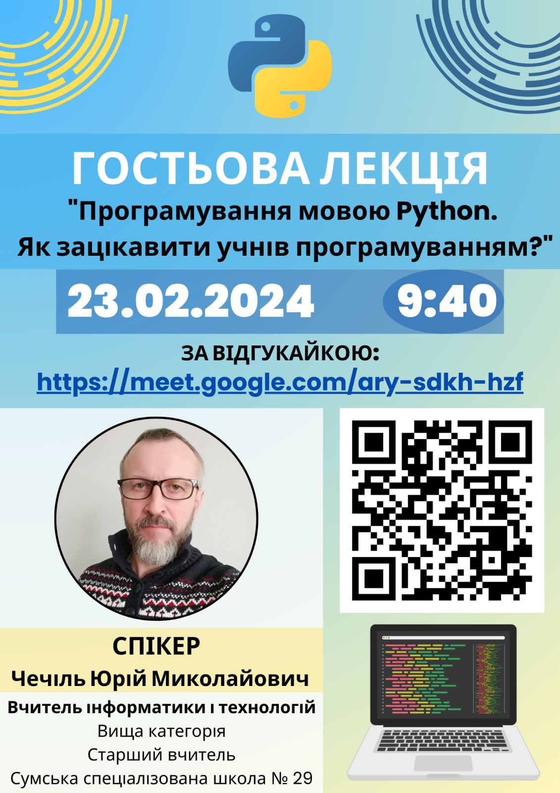 23 лютого 2024 року здобувачі вищої освіти освітнього ступеня «Бакалавр» Глухівського національного педагогічного університету імені Олександра Довженка спеціальності 014 Середня освіта, предметної спеціальності 014.10 Середня освіта (Трудове навчання та технології), які навчаються за освітньо-професійною програмою «Середня освіта (Трудове навчання та технології. Інформатика)» прослухали гостьову лекцію вчителя інформатики і технологій вищої категорії, старшого вчителя Сумської спеціалізованої школи №29 Чечіля Юрія Миколайовича на тему «Програмування мовою Python. Як зацікавити учнів?».